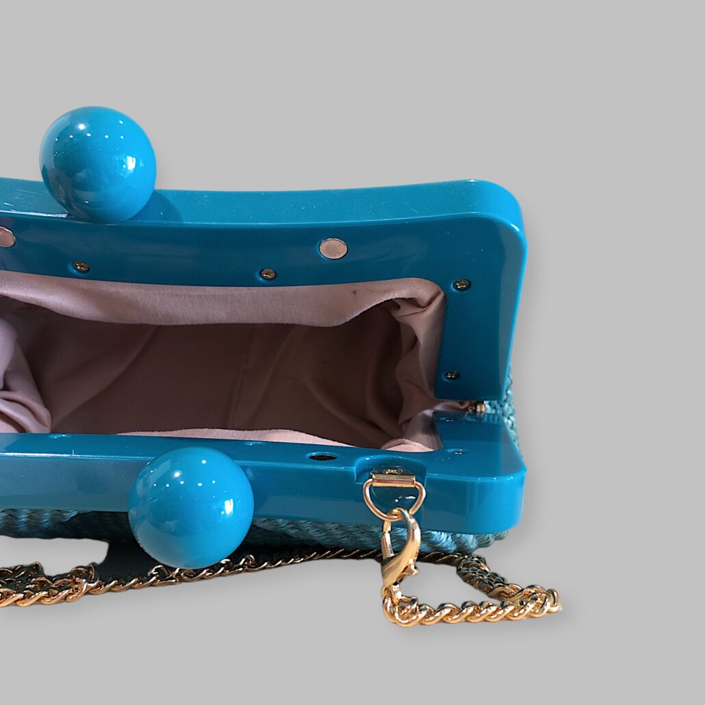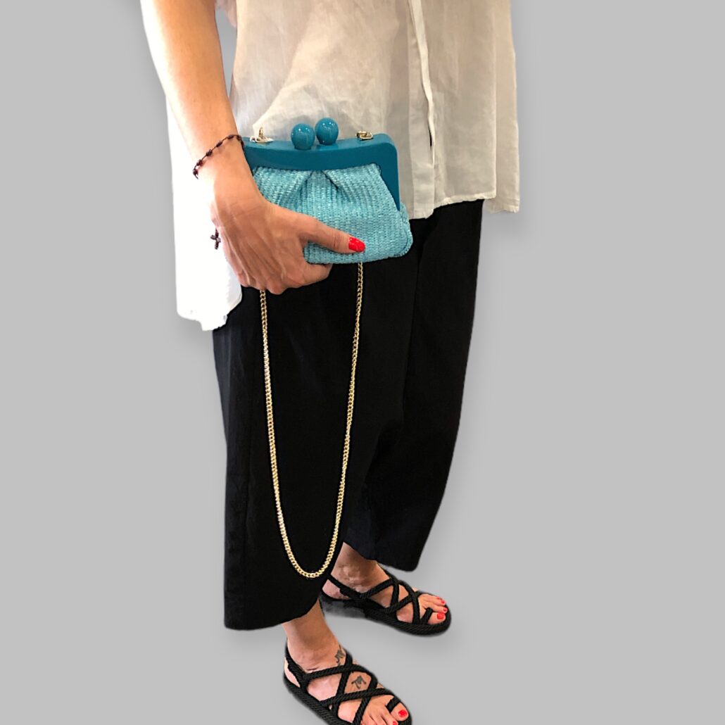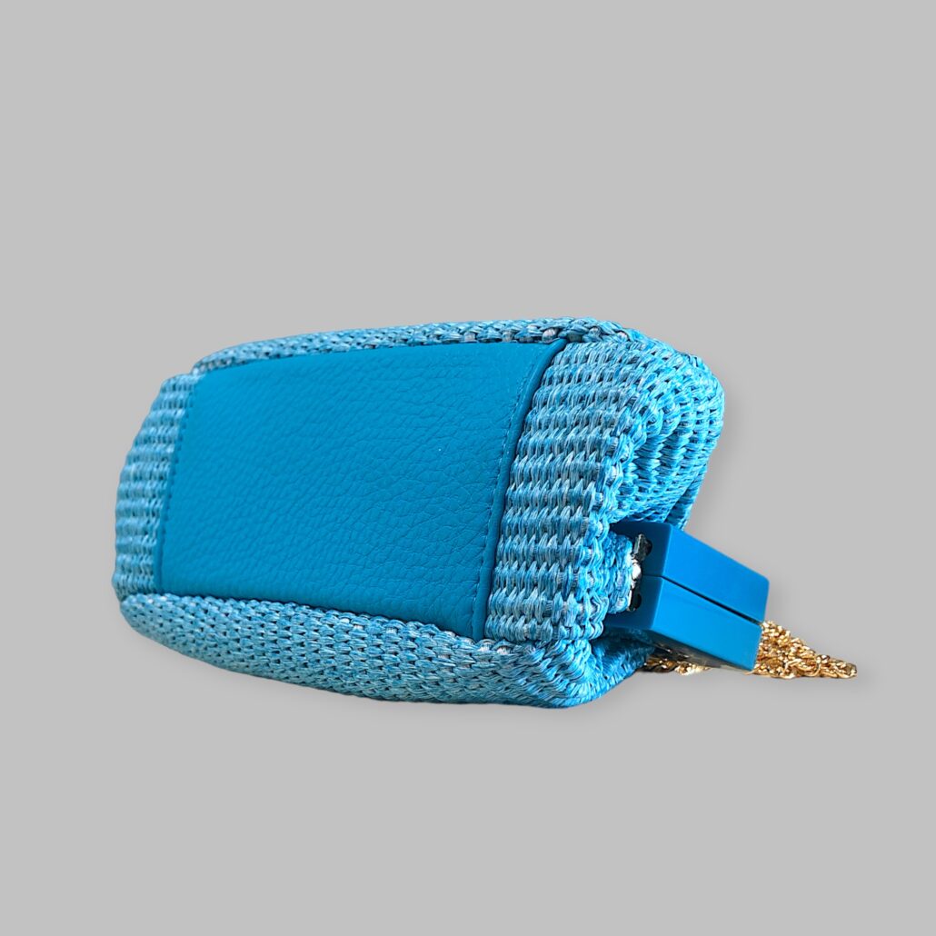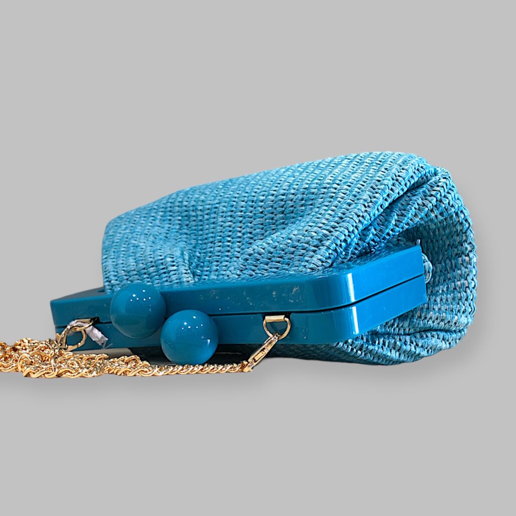 Clutch in rafia intrecciata e pelle, foderata internamente in tessuto. Tracolla a catena color oro. Doppie calamite all’interno per la chiusura.